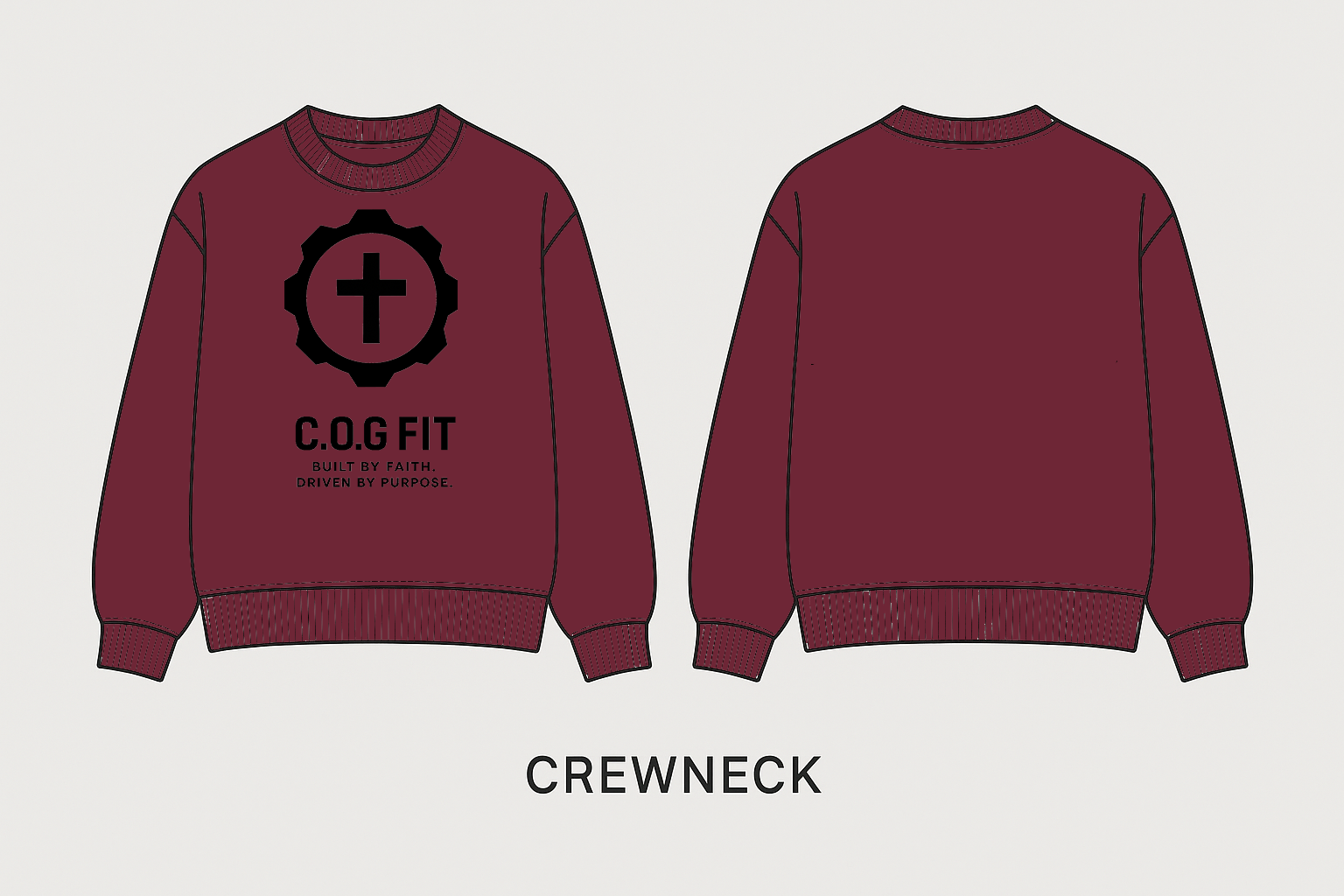 The COG FIT crewneck combines premium fleece with a timeless silhouette, designed to withstand both cold days and hard seasons. The front emblem centers your focus — faith first, discipline always.